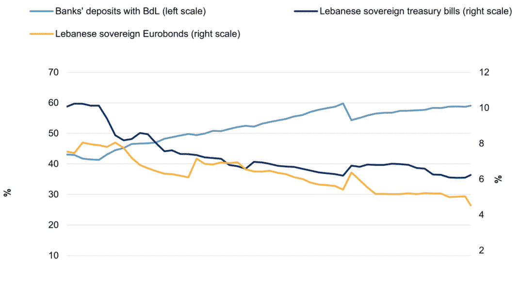 Theեկույցը հիշեցնում է, որ բանկերի ակտիվների 60% -ը ներդրվում է ավանդների վկայագրերի տեսքով, որոնք ներդրվել են Banque du Liban- ում և 11% -ը `եվրապարտատոմսերի և լիբանանյան ֆունտի գանձապետական պարտատոմսերի տեսքով: