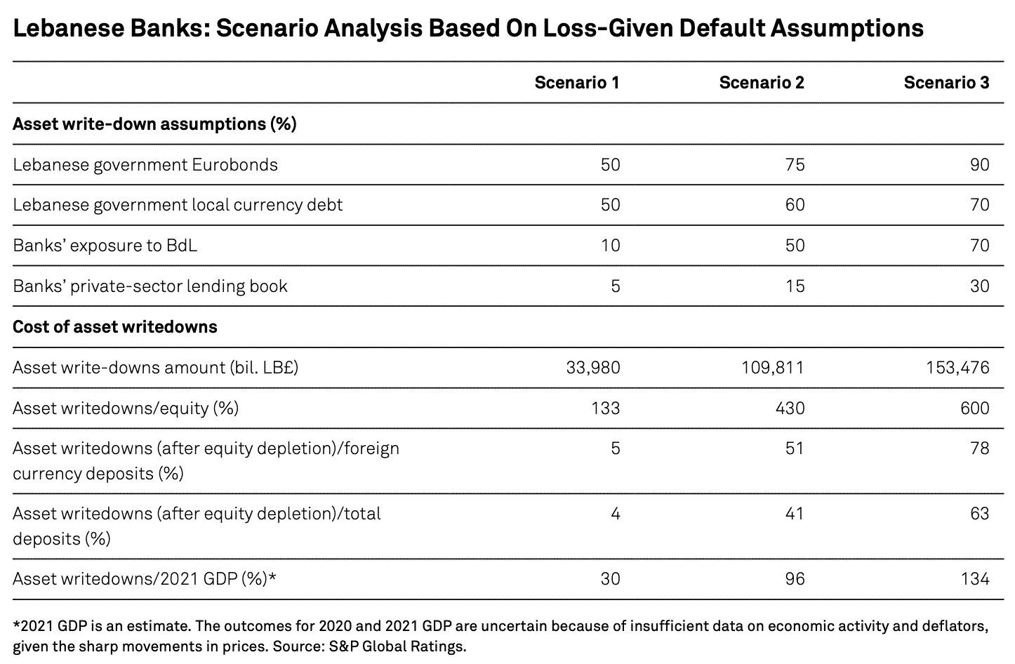 Այսպիսով, առաջ են բերվում երեք սցենարներ, որոնց արժեքը տատանվում է ՀՆԱ-ի 30% -ից 134% և դրանց համապատասխան ազդեցությունը հաճախորդների ավանդների վրա, ինչը կարող է հանգեցնել 4% -ից 63% սանրվածքների: Նշենք, որ 3 սցենարների համաձայն, ի վերջո, բանկերի սեփական միջոցները բոլորը սպառվել են ՝ կանխելով լիբանանյան տնտեսության աշխուժացումը: