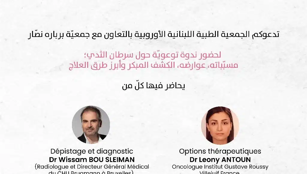 هذا وتنظم الجمعية الطبية اللبنانية الاوروبية وبالتعاون مع جمعية بربارة نصار لقاء توعوياً حول سرطان الثدي يحاضر فيه اطباء ومتخصصون أعضاء في الجمعية للاضاءة على مسببات السرطان، عوارضه، الكشف المبكر وأبرز طرق العلاج عبر تطبيق زوم وذلك يوم الاربعاء 29 تشرين الاول الساعة 7 مساء بتوقيت بيروت.