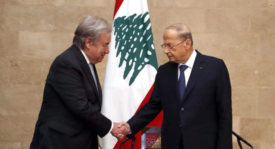 في كلمته أمام الأمين العام للأمم المتحدة ، حثه العماد عون على إيجاد حل فيما يتعلق بوجود مجموعة كبيرة من اللاجئين السوريين الموجودين في لبنان قبل أن يؤكد التزام أرض الأرز باحترام قرارات الأمم المتحدة المختلفة بما في ذلك قرار الأمم المتحدة رقم 1701 وقراره. السيادة كاستغلال لمواردها الطبيعية بما في ذلك تلك الموجودة في منطقتها البحرية الخالصة.