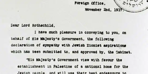 Le gouvernement de Sa Majesté envisage favorablement l’établissement en Palestine d’un Foyer national pour le peuple juif et emploiera tous ses efforts pour faciliter la réalisation de cet objectif, étant clairement entendu que rien ne sera fait qui puisse porter atteinte soit aux droits civils et religieux des collectivités non juives existant en Palestine, soit aux droits et au statut politiques dont les Juifs disposent dans tout autre pays.