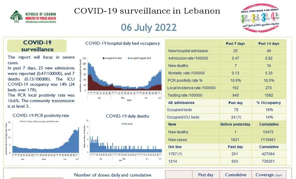Un mort est également à déplorer ce mercredi, portant le nombre total de décès à 197 personnes au cours des 14 derniers jours et au total de 10 472 personnes depuis l’apparition de la maladie sur le territoire libanais.