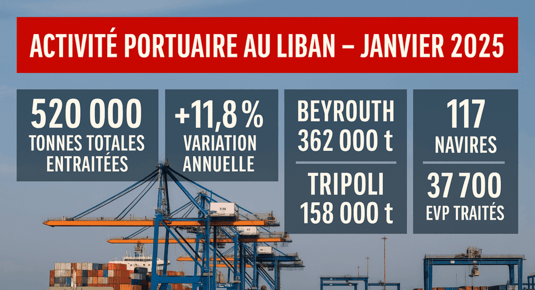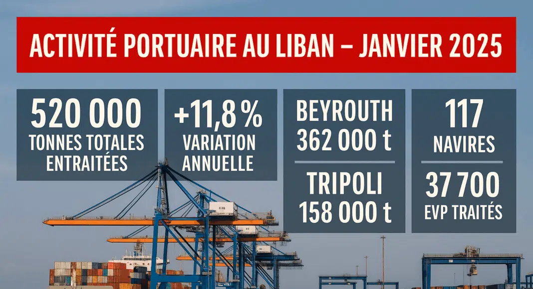 En janvier 2025, les ports de Beyrouth et Tripoli ont traité un total de 520 000 tonnes de marchandises, en progression de 11,8 % par rapport à janvier 2024 (465 000 tonnes). Cette hausse concerne à la fois le port de Beyrouth, principal terminal libanais, et le port de Tripoli, en expansion progressive.