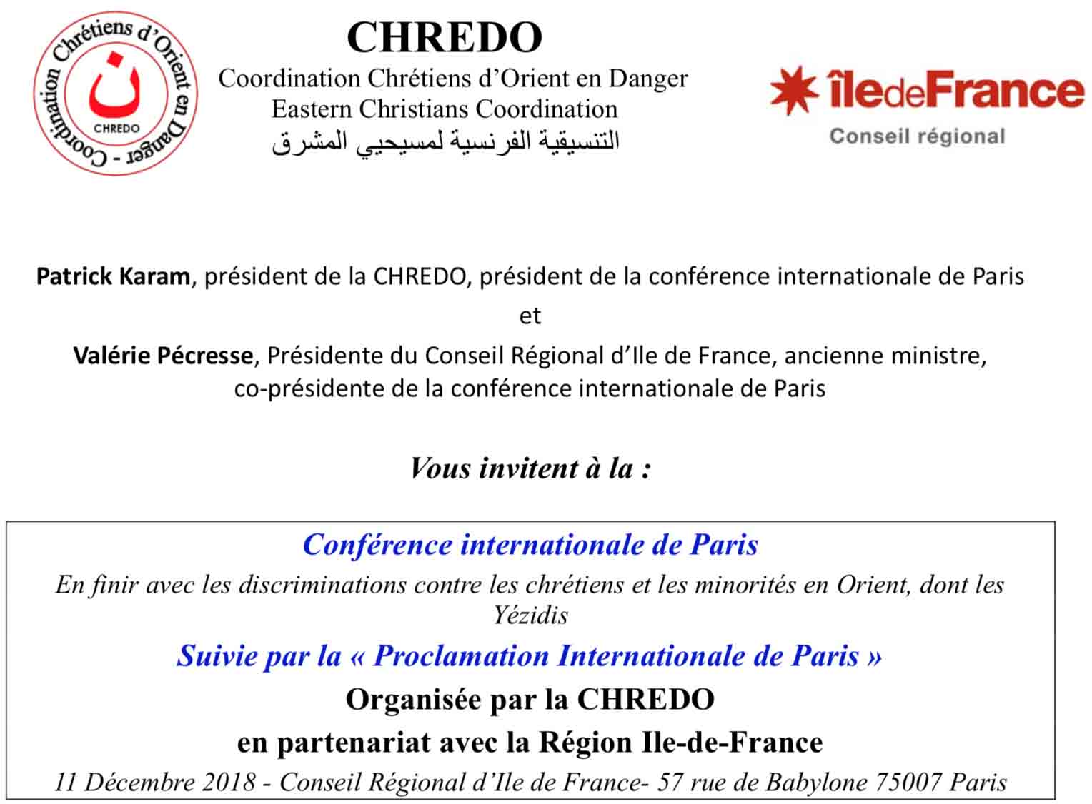 Patrick Karam, « président de la Coordination des Chrétiens d’Orient en Danger (CHREDO) » a l’honneur de vous inviter à la conférence internationale en soutien aux chrétiens d’Orient qui se tiendra le mardi 11 décembre au Conseil régional d’Ile De France à Paris.
