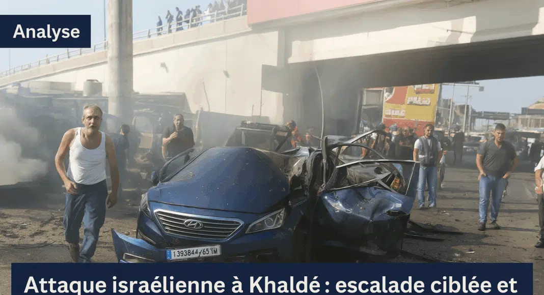 Le 4 juillet 2025, un drone israélien a ciblé un véhicule circulant dans la région de Khaldé, au sud de Beyrouth, provoquant une explosion violente à proximité d’un tunnel routier. Le véhicule visé, selon des sources sécuritaires libanaises, n’était pas officiellement identifié au moment de l’attaque. L’explosion a tué une personne à bord et blessé trois autres, dont deux membres des services de secours arrivés en première ligne. Plusieurs autres véhicules, garés ou en circulation dans la zone, ont été endommagés. Des vitres de commerces et habitations ont été soufflées par l’onde de choc.