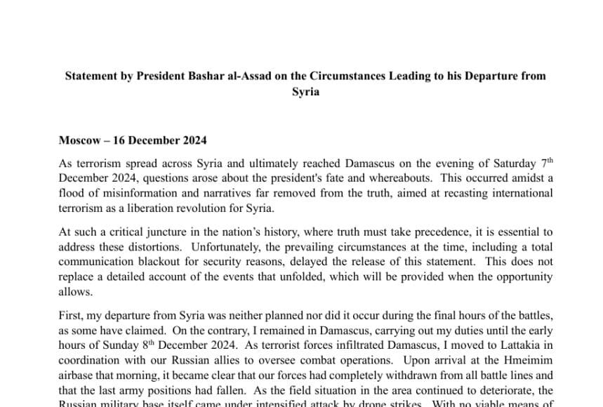 Pour la première fois depuis la chute de Damas aux mains des forces armées terroristes le 7 décembre 2024, Bachar el-Assad, ancien président syrien, s’est exprimé dans un communiqué officiel depuis Moscou. Ce discours intervient dans un contexte marqué par le chaos, les rumeurs et la désinformation qui entourent les circonstances de son départ et la fin de son régime. Face à la nécessité de clarifier les événements récents, Assad a tenu à rétablir sa version des faits.