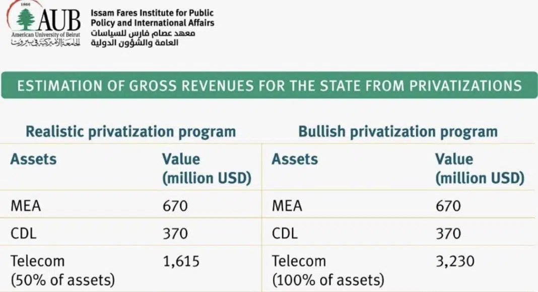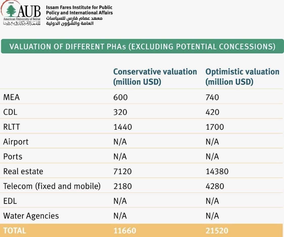Le 25 janvier 2021, le journaliste Albert Kostanian, chercheur en politique économique à l’Institut Issam Farès (IFI) pour les politiques publiques de l’Université américaine de Beyrouth (AUB), a publié une étude sur la valeur des biens publics excluant la façade maritime, les montagnes ou encore les domaines ferroviaires et les biens immobiliers détenus par les municipalités car ne pouvant pas, selon lui, faire l’objet de privatisations. Selon son étude, la MEA vaudrait environ 670 millions de dollars (jusque-là évaluée par le gouverneur de la BDL Riad Salamé à 1 milliard de dollars[2]), le Casino du Liban environ 370 millions de dollars, les 860 millions de mètres carrés de biens immobiliers publics (dont 85% se trouvent dans la Békaa) environ 10,75 milliards de dollars, les Télécoms environ 3,2 milliards de dollars (pourtant évalués entre 4 et 10 milliards de dollars par McKinsey[3]), la Régie des Tabacs et Tombacs environ 1,57 milliards de dollars, etc. L’étude précise qu’en l’absence d’information financière détaillée comme des bilans et des comptes de résultat de tous ces biens publics, il est extrêmement compliqué d’en établir une évaluation.