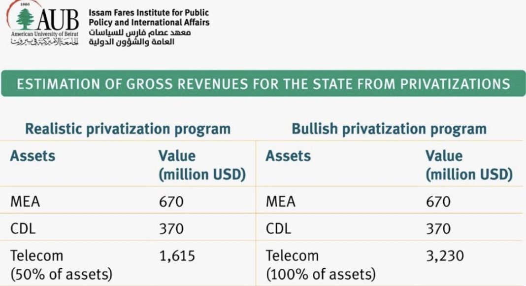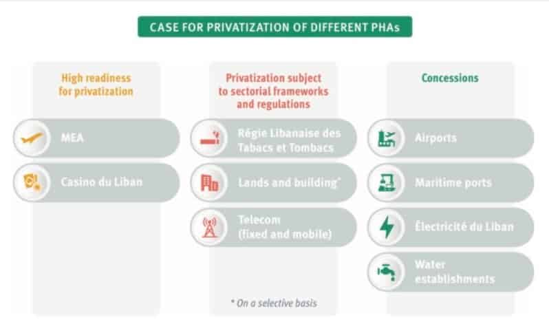 Les actifs de l’État et de la Banque du Liban (BDL) sont entre autres les Télécoms (Ogero, Touch et Alfa), Électricité du Liban (EDL), l’eau ainsi que les biens immobiliers publics et des parts dans la Middle East Airlines (MEA), le Casino du Liban, la Régie des Tabacs et Tombacs, les ports de Beyrouth, Tripoli, Saïda et Tyr, la foire internationale Rachid Karamé, la Cité sportive Camille Chamoun, le développeur immobilier Elyssar, les aéroports de Beyrouth (international), Koleïat, Hamate et Rayak, Intra Investment Company et Finance Bank, etc. Les ressources pétrolières et gazières du Liban qui pourraient être très importantes sont pour le moment des actifs intangibles puisqu’elles ne sont pas encore des réserves (les forages n’ont pas encore confirmé l’existence possible, probable ou prouvée de réserves) et que celles-ci ne produisent donc pas encore. Par ailleurs, la distinction entre actifs de l’État et actifs de la Banque Centrale devrait peut-être demeurer pour éviter des saisies par les détenteurs d’Eurobonds[1]. L’ABL, Carlos Ghosn et d’autres pensent que la façade maritime, les montagnes ou encore les domaines ferroviaires et les biens immobiliers détenus par les municipalités sont également des biens publics.