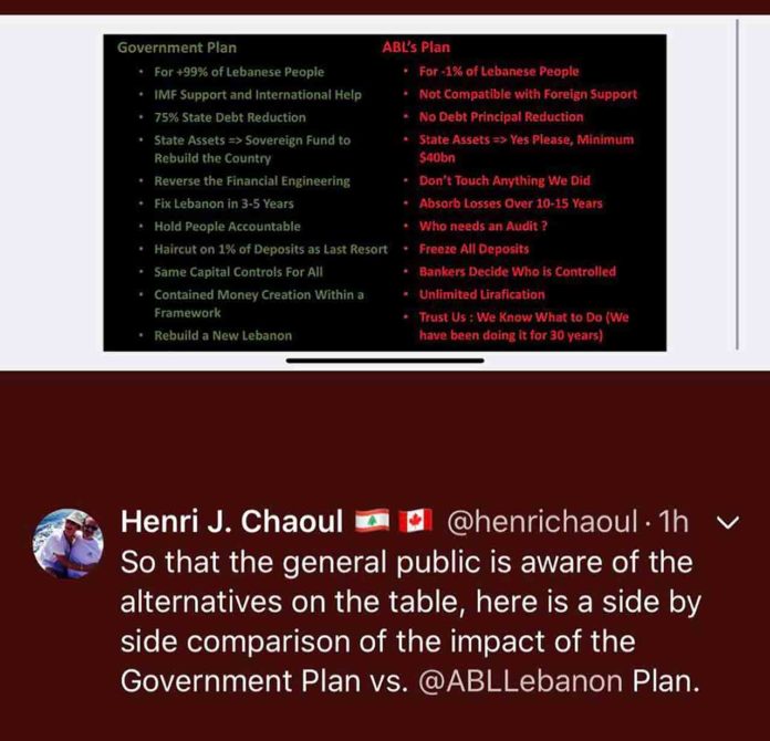 L’ABL ne reconnait pas le montant des pertes évaluées par le gouvernement (154 000 milliards de livres libanaises) et le Fonds monétaire international (Chloé Cornish du Financial Times a cité une source au FMI les évaluant à 170 000 milliards de livres libanaises) mais celui présenté par la Commission parlementaire aux Finances et au Budget présidée par le député du Metn-Nord Ibrahim Kanaan, membre du Courant patriotique libre (81 000 milliards de livres libanaises). Cette situation a entraîné la suspension des négociations du gouvernement avec le Fonds monétaire international (FMI) car la véritable raison derrière le calcul du montant des pertes est leur reconnaissance même et le partage équitable de celles-ci voulu par le plan du gouvernement préparé avec Lazard sous la direction d’Alain Bifani (alors directeur général du ministère des Finances) entre l’État, la BDL, les banques et leurs actionnaires (« mergers »,« write-off », « wipe-out » et « capital increase ») et les plus grands déposants (« haircut » et « bail-in »). Au lieu de cela, comme le rappelle le consultant financier Mike Azar, il y a eu un contrôle des capitaux illégal, l’absence d’audit juri-comptable (« forensic audit ») et de réformes, une dévaluation et une lirification de fait, une hyperinflation et un appauvrissement généralisé. Ni les fonds de la CEDRE (la Conférence économique pour le développement par les réformes et avec les entreprises) ni ceux du FMI n’ont donc été débloqués.