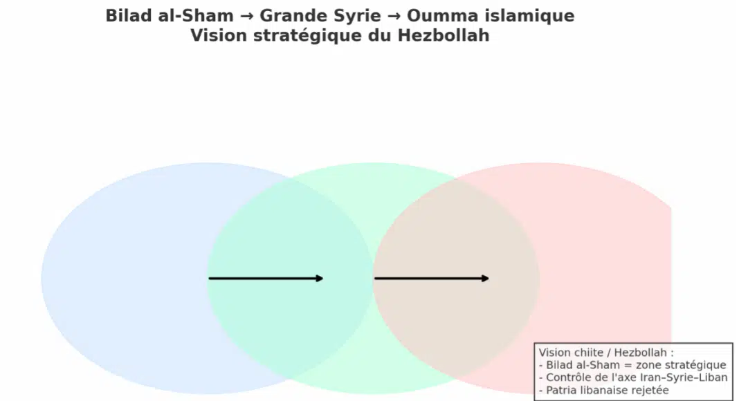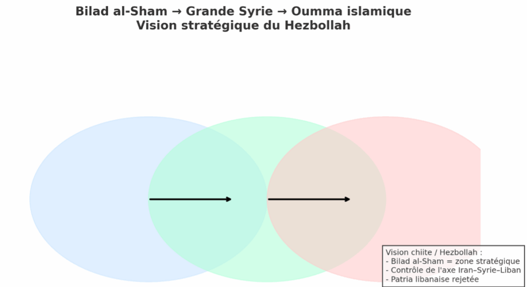 Bilad al-Sham est la matrice historique d’une vision régionale unifiée. La Grande Syrie en est la traduction nationaliste moderne, tandis que la Oumma islamique en est la traduction religieuse globale. Pour le Hezbollah, la patrie libanaise est secondaire face à l’unité religieuse et stratégique du Levant.