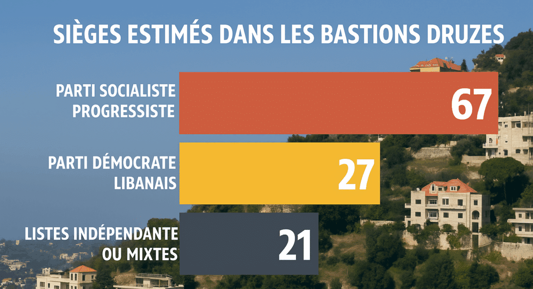 Les élections municipales du 4 mai 2025 dans les zones druzes du Mont-Liban ont offert une lecture précise des rapports de force entre les formations politiques druzes traditionnelles. Le Parti socialiste progressiste (PSP) dirigé par Taymour Joumblatt et le Parti démocrate libanais de Talal Arslan se sont partagé la majorité des municipalités du Chouf et de Aley, dans un climat local de relative stabilité. À Aley, le PSP a soutenu des listes d’unité dans les grandes villes telles que Aley centre, Choueifat et Bchamoun. À Choueifat, les candidats soutenus par le PSP ont remporté 13 des 21 sièges. À Bchamoun, le PSP a constitué une liste commune avec des notables indépendants et a obtenu 9 sièges sur 12. À Aaramoun, le PSP n’a pas présenté de liste officielle mais a appuyé une formation mixte qui a battu la liste soutenue par le Parti démocrate libanais, avec 8 sièges sur 12.