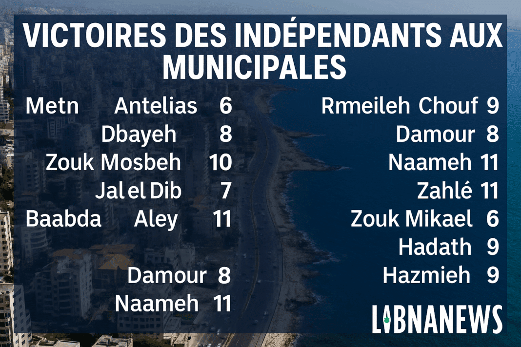 Listes indépendantes ou mixtes : 21 sièges (principalement à Ain Dara, Naameh, Ras el Jabal)