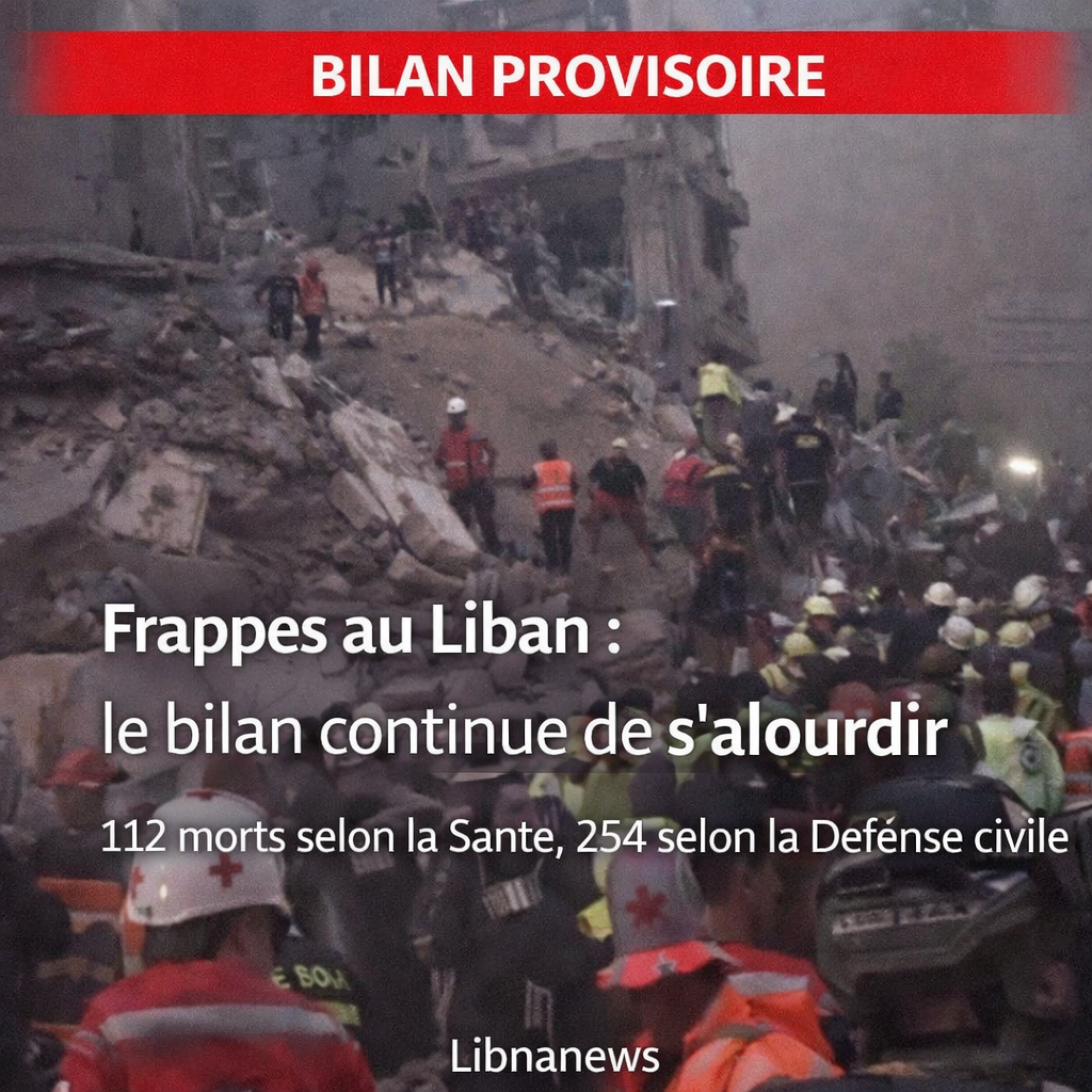 Le bilan des frappes israéliennes menées mercredi au Liban continue de s’alourdir, dans une confusion qui dit à elle seule l’ampleur du choc. Selon un bilan provisoire actualisé du ministère libanais de la Santé, les bombardements sur Beyrouth et d’autres régions ont fait 112 morts et 837 blessés. De son côté, la Défense civile libanaise avance un bilan bien plus lourd de 254 morts et plus de 1 129 blessés. Dans les deux cas, il s’agit de bilans provisoires qui incluent de nombreux civils. Les recherches se poursuivent sous les décombres, tandis que de nombreuses familles continuent de chercher leurs proches dans les hôpitaux, les morgues et les centres d’urgence.