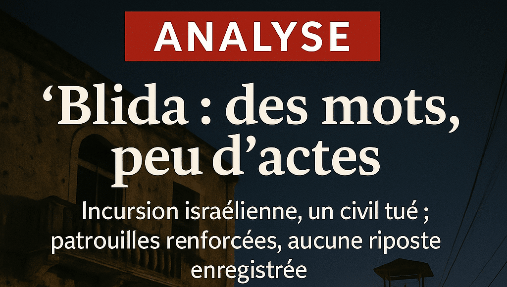 Le village de Blida, à un kilomètre de la Ligne bleue, a été le théâtre d’une incursion israélienne sanglante dans la nuit du 29 au 30 octobre 2025. Des soldats de Tsahal ont pénétré dans la mairie locale, abattant Ibrahim Salamé, employé municipal de 55 ans qui assurait un tour de garde. Le président Joseph Aoun a réagi par un ordre sans précédent : « s’opposer à toute incursion israélienne » et « faire face » pour défendre le territoire. À ce 31 octobre, pourtant, l’armée libanaise n’a enregistré aucun accrochage direct. Des patrouilles renforcées et des déploiements défensifs : voilà l’étendue de la réponse sur le terrain. Ce décalage entre rhétorique présidentielle tonitruante et inaction opérationnelle cristallise les faiblesses structurelles des Forces armées libanaises (FAL) et conforte le Hezbollah dans son refus obstiné de désarmement, au mépris de la résolution 1701 de l’ONU.