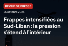 Revue de presse — 25 octobre 2025. Intensification des frappes israéliennes au Liban (Békaa, Nabatiyé, intérieur), ciblages et guerre psychologique. Coordination américano-israélienne alléguée, débats internes libanais entre 1701 et fermeté. Pistes diplomatiques via Égypte, Russie, Chine et sommet arabe au Caire, sur fond de risques d’embrasement régional.