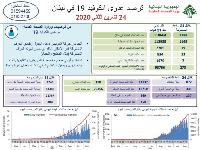 Les autorités libanaises annoncent que 1 188 personnes ont été testées positives. Le nombre de décès est de 23 personnes.