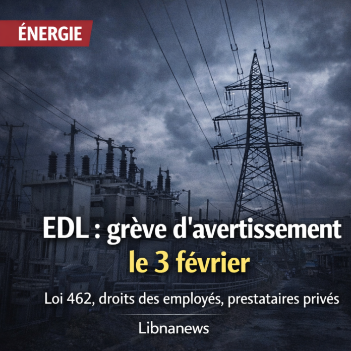 Le syndicat d’Électricité du Liban (EDL) annonce une grève d’avertissement et un sit-in le 3 février 2026 dans tous les centres, avec arrêt des tâches administratives. Il refuse toute modification de la loi 462 sans consultation, s’oppose à l’élargissement des prestataires privés et réclame le règlement des indemnités de fin de service.