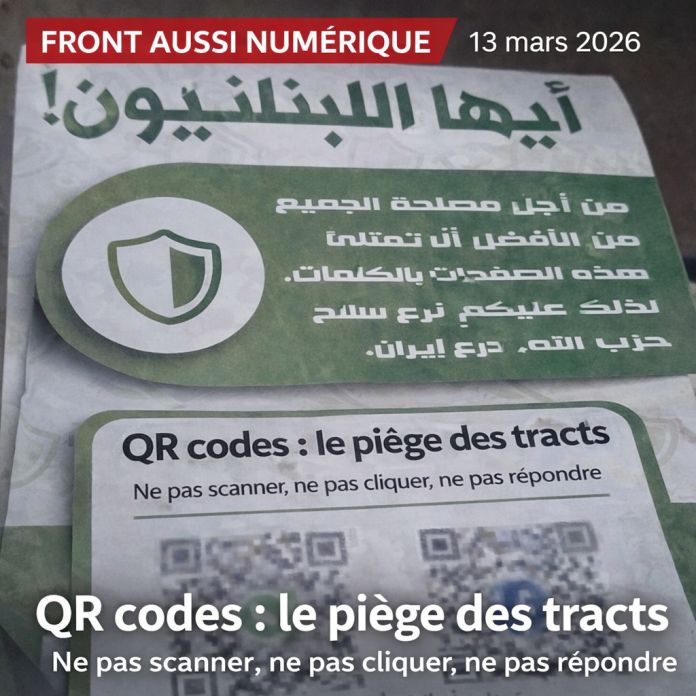 À Beyrouth, un tract politique muni de QR codes illustre l’extension de la guerre psychologique au Liban. Au-delà du message contre le Hezbollah, le document soulève un risque concret de captation d’informations. Dans un contexte de bombardements et d’évacuations, la consigne essentielle reste claire : ne pas scanner.