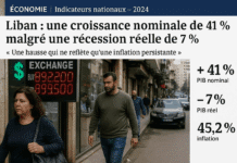 Le produit intérieur brut du Liban a atteint 2 943 000 milliards de livres en 2024, soit 32,8 milliards de dollars. Cette hausse de 41 % est purement nominale, car le PIB réel s’est contracté de 7 %, avec une consommation privée en recul de 14,9 % et un effondrement de l’investissement. L’inflation, le creusement du déficit extérieur et la dollarisation totale confirment une économie en crise, où la croissance statistique masque un affaissement productif.