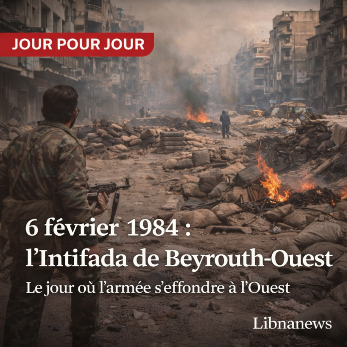 Le 6 février 1984, Beyrouth-Ouest bascule : des milices d’Amal et du PSP affrontent l’armée libanaise, provoquant désertions et effondrement de l’autorité étatique. Cet épisode, appelé « Intifada du 6 février », accélère l’annulation de l’accord du 17 mai, le retrait occidental et le retour syrien.