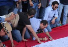 Samy Gemayel a troqué son costume de député pour le jeans et pull-over sport. Comble de l’élégance, il porte le drapeau libanais en écharpe...