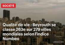 #SOCIETE: n 2025, Beyrouth est classée 263e sur 279 villes dans l’indice mondial de qualité de vie de Numbeo. La capitale libanaise occupe la 13e place sur 15 villes arabes. Les principaux freins sont la pollution, le faible pouvoir d’achat, le coût de la vie et la dégradation des infrastructures publiques. Beyrouth devance de justesse Nairobi et Jakarta, mais reste loin derrière Casablanca et Amman. La note globale de Beyrouth atteint 90,4 points contre une moyenne mondiale de 156,2.