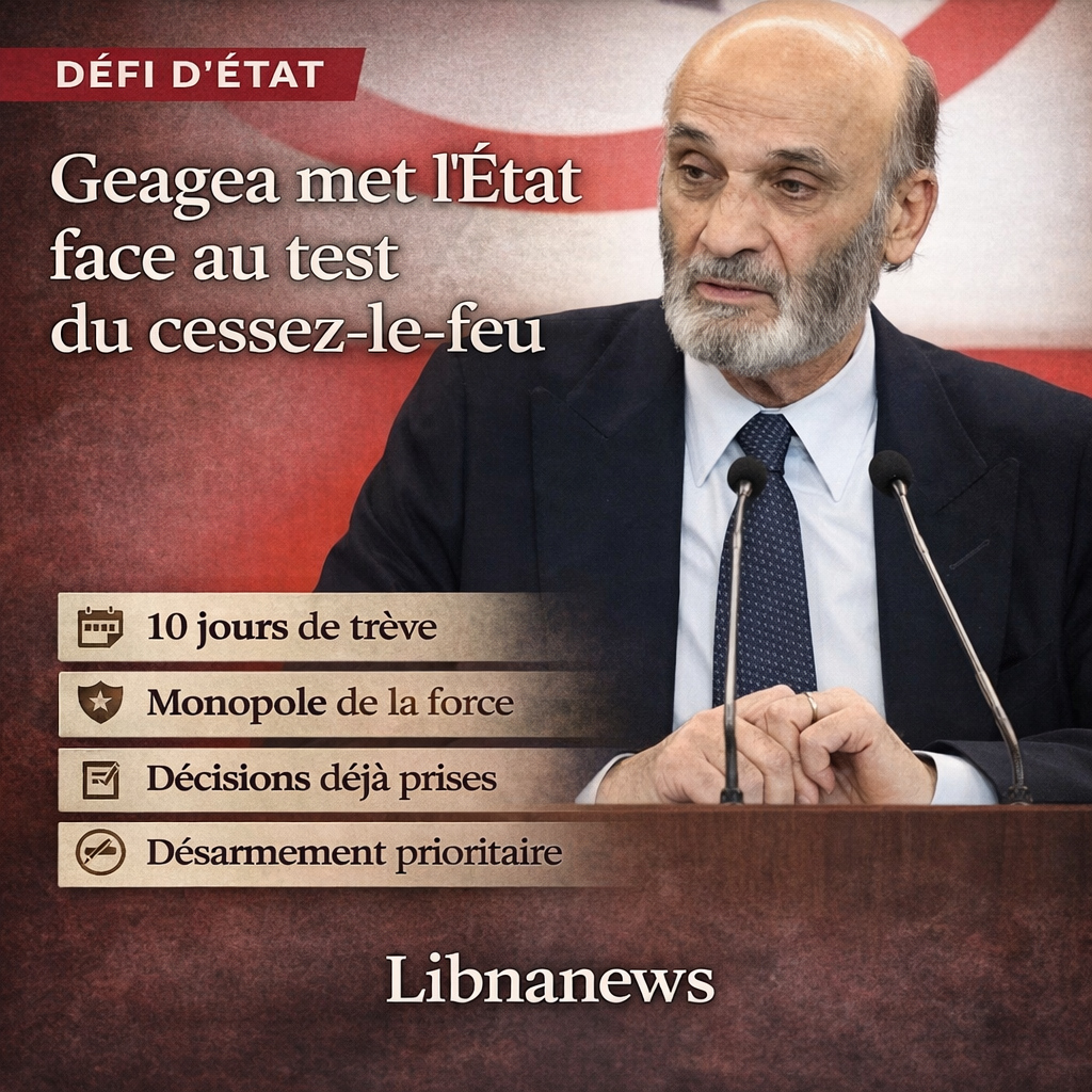 Le dirigeant chrétien a placé le débat sur un terrain direct. Selon lui, aucune sortie durable de crise n’est possible tant que la décision de guerre et de paix échappe à l’État. Il a ainsi présenté la fenêtre du cessez-le-feu comme un moment décisif pour montrer que le Liban est capable d’agir comme un véritable État, de faire respecter ses choix et de reprendre une autorité qu’il juge confisquée depuis trop longtemps par les armes non étatiques.