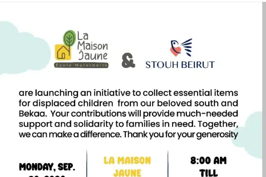 La Maison Jaune, en collaboration avec Stouh Beirut, lance une initiative solidaire pour collecter des articles essentiels destinés aux enfants déplacés des régions du Sud et de la Bekaa. Cette collecte vise à apporter un soutien vital aux familles dans le besoin, leur offrant un peu de réconfort en ces temps difficiles. Ensemble, par nos contributions, nous pouvons faire une différence.