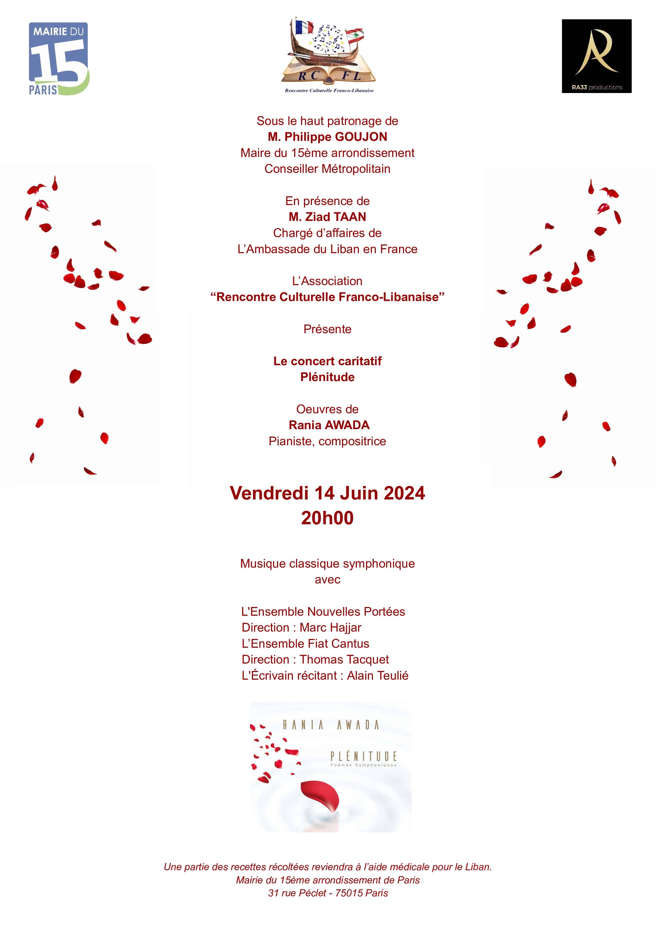 Sous le haut patronage de M. Philippe GOUJON, maire du 15ème arrondissement à Paris et en présence de M. Ziad TAAN, chargé d’affaires de l’ambassade du Liban en France, la RCFL organise, le 14 juin 2024 (à 20h), un concert caritatif « PLÉNITUDE », œuvres de Rania AWADA, pianiste et compositrice, inspirées des plus grands auteurs de la littérature française : C. Baudelaire, A. De Musset, V. Hugo, A. Rimbaud, G ; Sand.