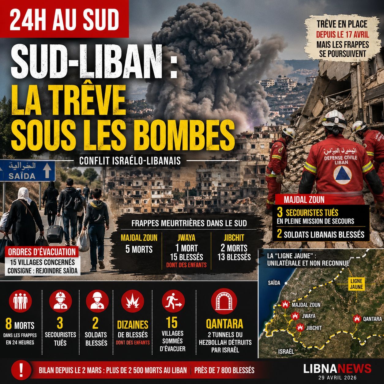 Mercredi 29 avril, à 9 h 30, le conflit israélo-libanais reste dominé par une séquence de frappes, d’ordres d’évacuation et d’accusations croisées autour du cessez-le-feu. Les dernières vingt-quatre heures ont surtout touché le Sud-Liban, avec des victimes civiles, des secouristes tués, des soldats libanais blessés et une nouvelle démonstration militaire israélienne autour de Qantara.