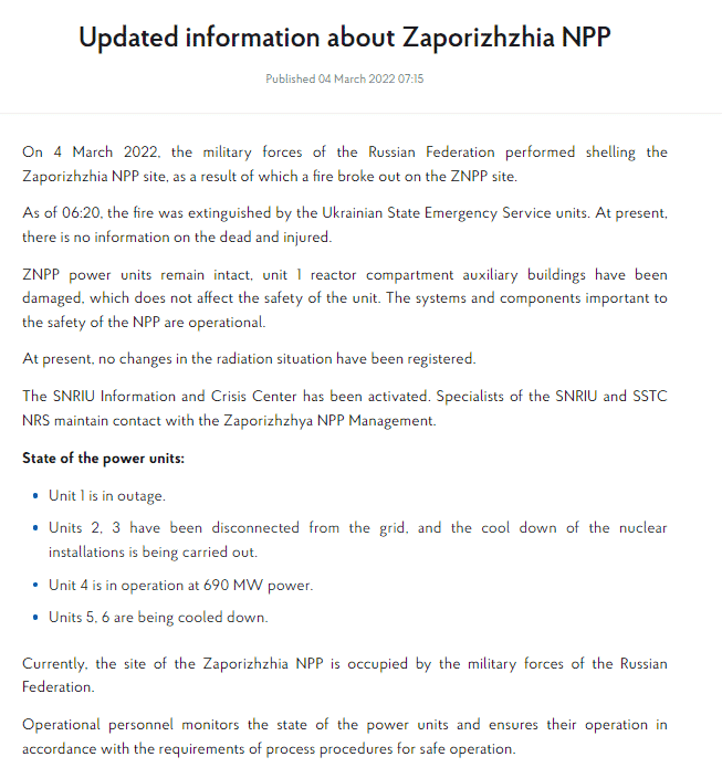 Les forces russes ont bombardé et pris la plus grande centrale nucléaire d’Europe, située au niveau de la localité de Zaporijia. Ces bombardements ont provoqué un incendie dont la localisation exacte n’a pas été révélée mais provoquant une grande inquiétude quant à la sécurité des réacteurs dans la nuit à l’intérieur du périmètre de la centrale. Les tirs avaient alors empêché les pompiers d’intervenir sur les lieux.