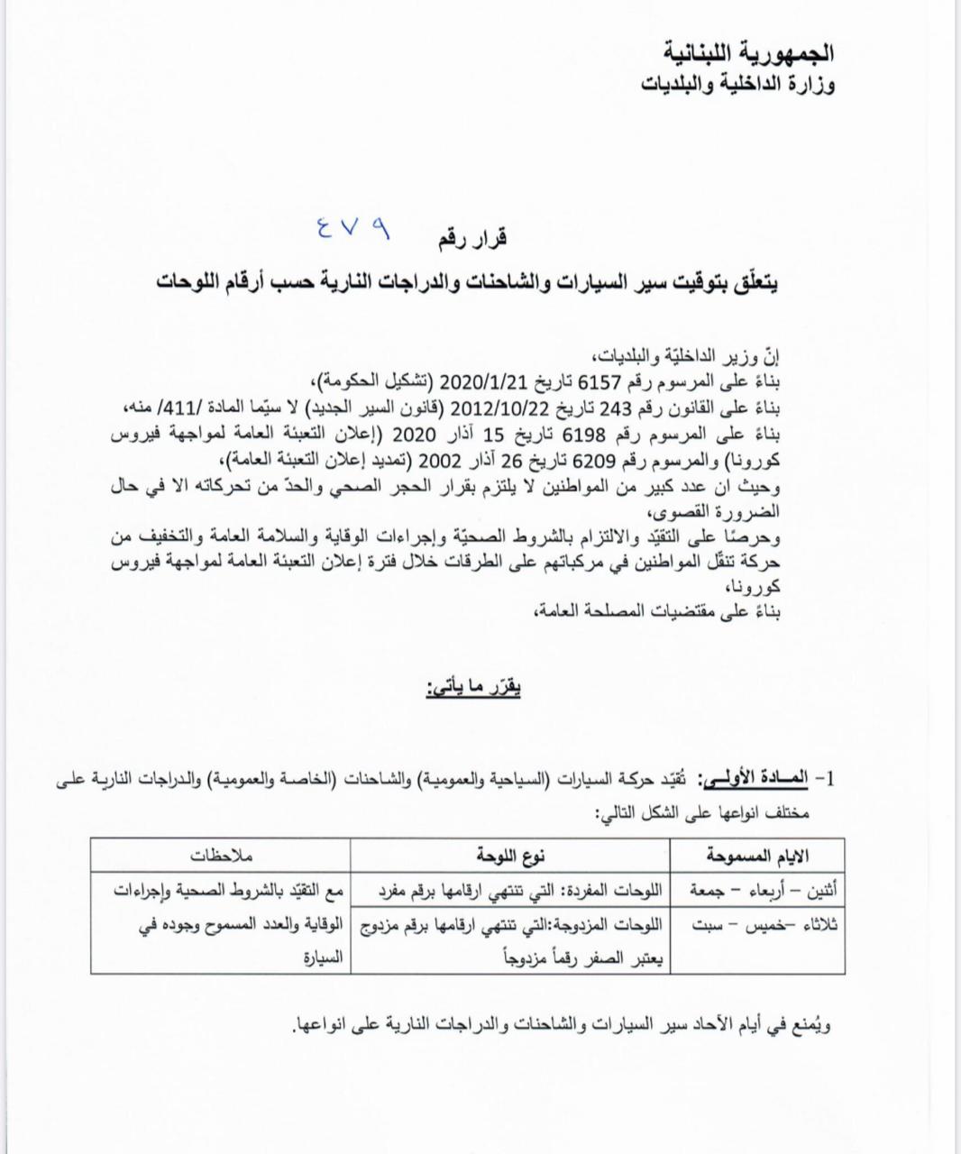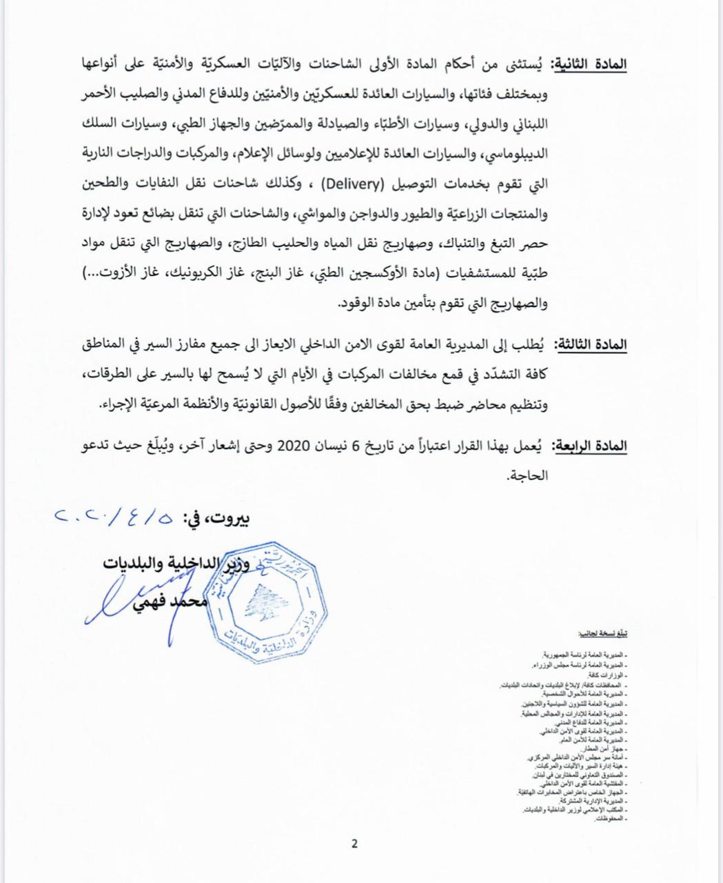 Ces dispositions excluent les camions de transport alimentaire, véhicules militaires, forces de sécurité intérieure, Croix Rouge Libanaise, les voitures de médecins, pharmaciens ou encore infirmières, médias et membres du corps diplomatique ainsi que les camions de déchets.