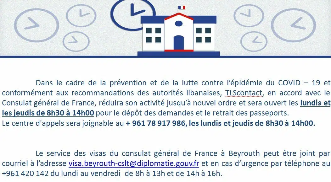 Dans le cadre de la prévention et de la lutte contre l’épidémie du COVID-19 et conformément aux recommandations des autorités libanaises, TLScontact, en accord avec le Consulat général de France, réduira son activité jusqu’a nouvel ordre et sera ouvert les lundis et les jeudis de 8h30 a 14h00 pour le dépôt des demandes et le retrait des passeports.