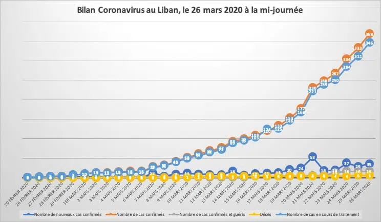 Le Ministère de la santé a indiqué que le nombre de personnes contaminées par le coronavirus au Liban serait désormais de 368 personnes, soit une hausse de 35 cas contre une hausse 29 cas hier.
