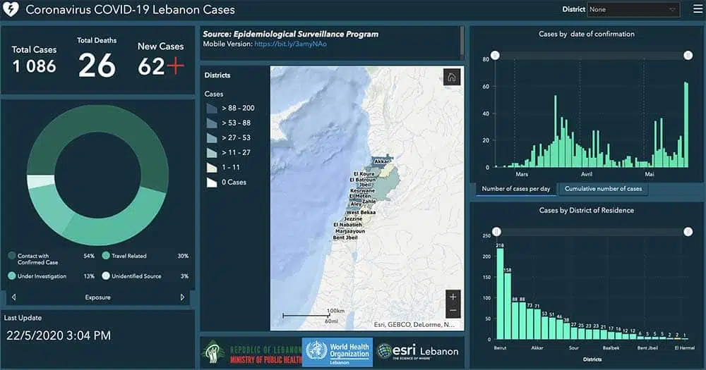 22 nouveaux cas de personnes infectées par le coronavirus COVID19 ont été détectés au Liban, portant le nombre total de cas à 1086 cas, indique le Ministère de la Santé. Ce dernier avait déjà annoncé hier, une forte hausse du nombre de cas, faisant craindre qu’une extension importante de la maladie au Pays des Cèdres.