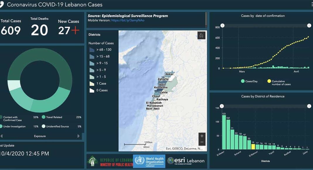 Le Ministère de la santé fait état de la contamination de 609 personnes par le coronavirus COVID-19, 27 de plus qu’hier. Un nouveau mort est également annoncé, portant le bilan à 20 décès depuis l’apparition de la maladie au Liban, le 21 février.