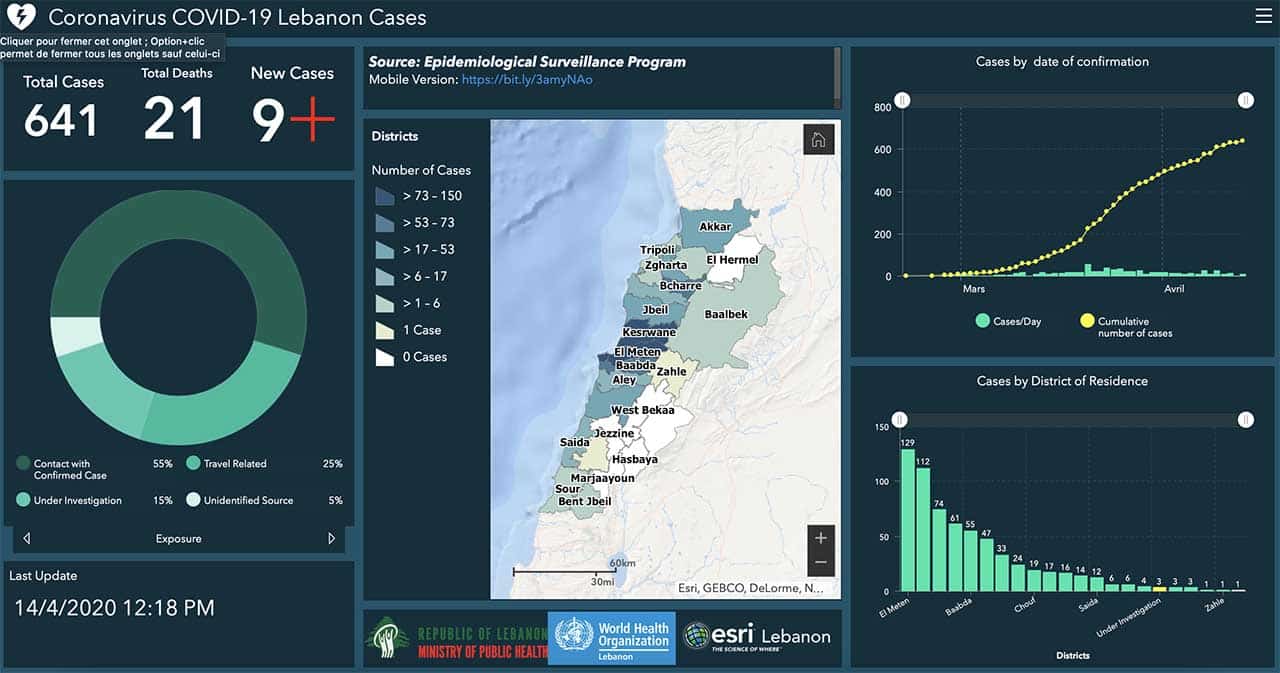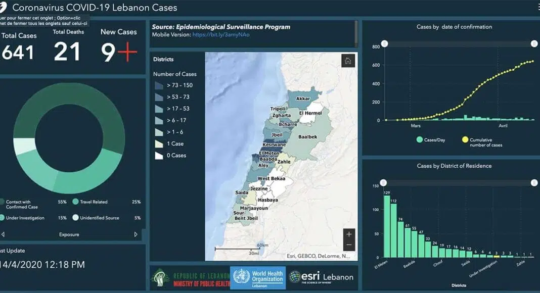 Le ministère de la santé annonce un nouveau décès au Liban, portant le nombre de personnes décédées à 21. Par ailleurs, le nombre de personnes contaminées reprend sa hausse, avec 9 nouveaux cas, s’établissant désormais à 641 cas.