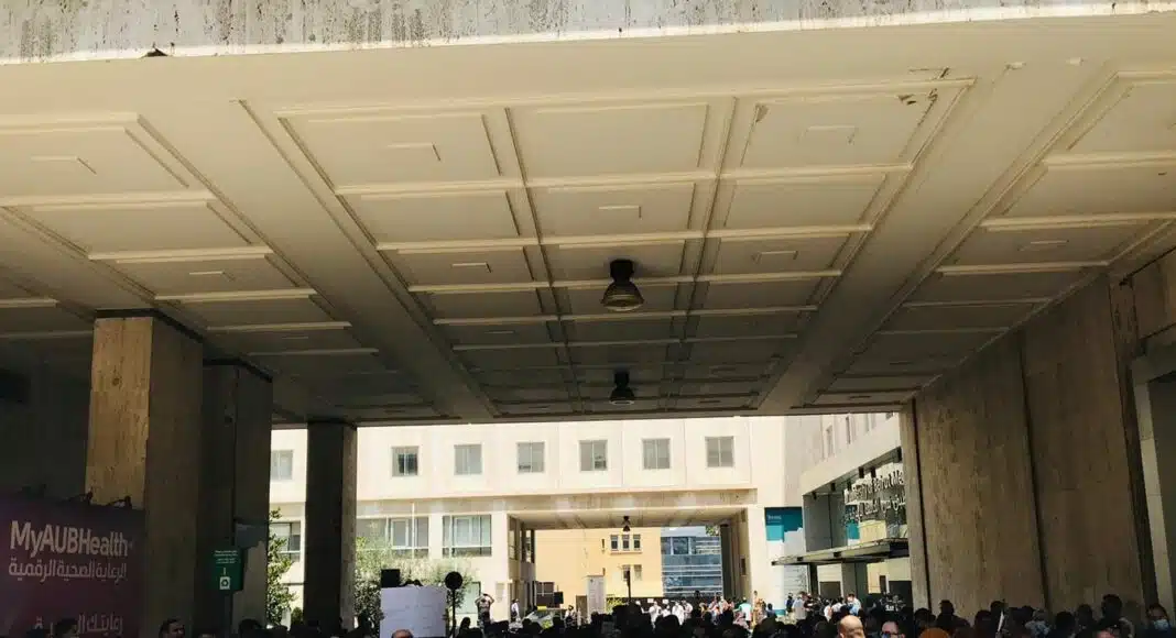 Le personnel de l’American University of Beirut (AUB) et de l’American University Hospital (AUH) manifestent suite à la décision de l’institution de renvoyer une partie importante du personnel en raison de la crise économique qui touche le Pays des Cèdres.