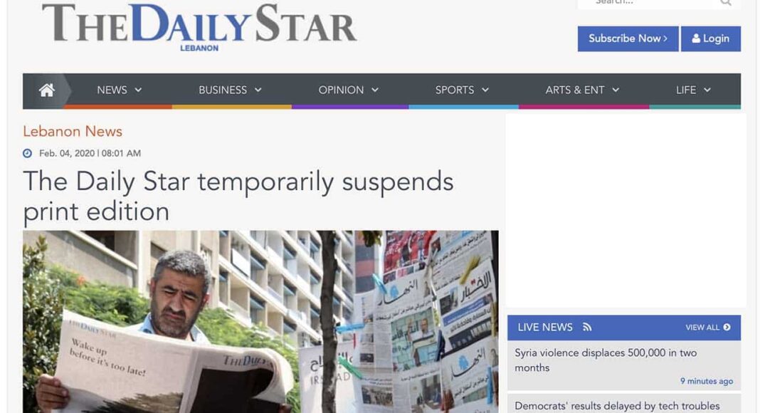 Après Radio One qui ferme définitivement, la LBCI qui crypte son signal et rend ses émissions payantes et qui sera suivi d’ici peu par la MTV Lebanon, le quotidien libanais anglophone The Daily Star a annoncé la suspension – temporaire – de l’impression de son édition papier en raison de la crise économique.