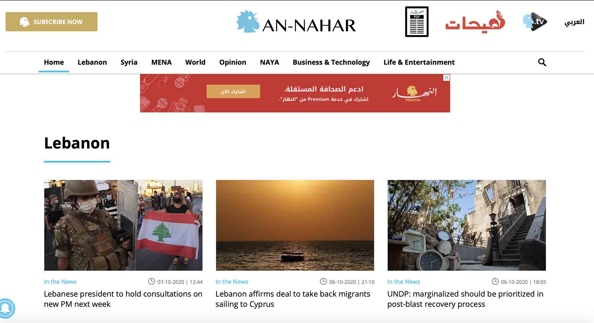 Le quotidien An Nahar annonce avoir suspendu son édition en ligne en langue anglaise en raison de la crise économique. Pour l’heure, on ignore si les 15 employés du quotidien seront redéployés au sein de l’entreprise ou non.