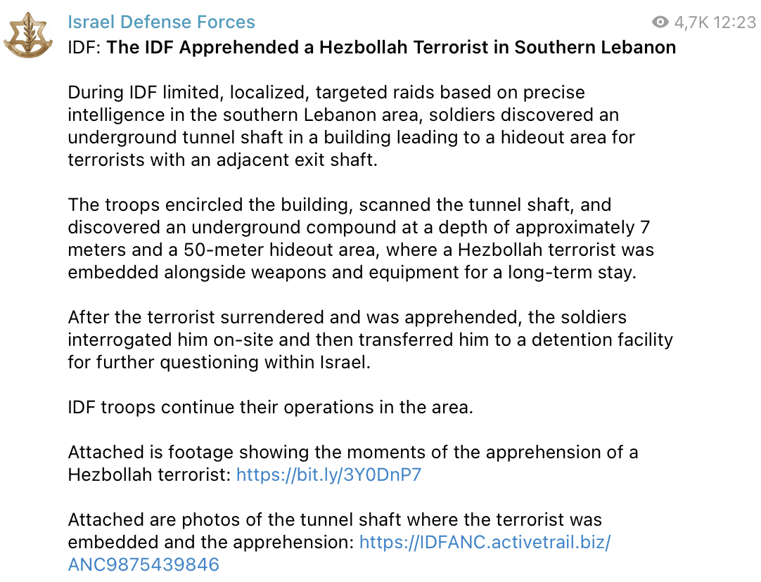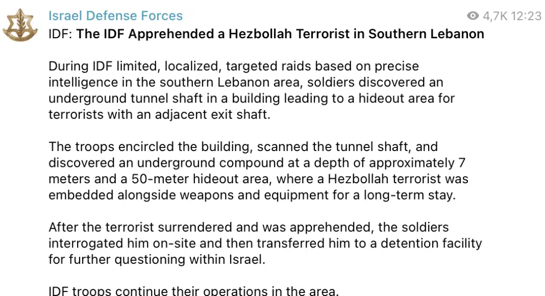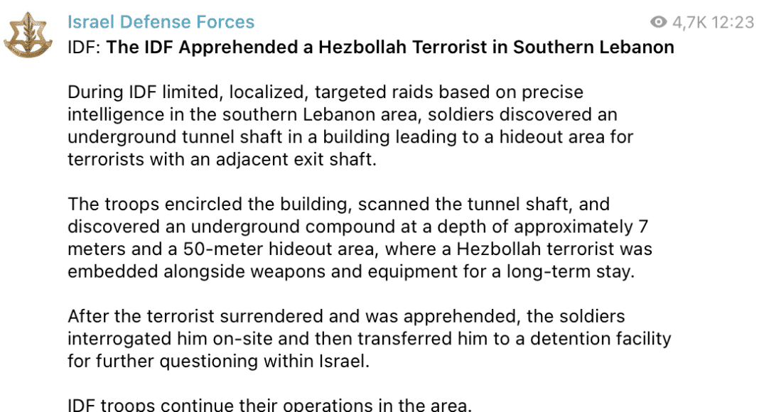 L’armée israélienne (IDF) a annoncé avoir appréhendé un terroriste du Hezbollah lors d’un raid ciblé dans le sud du Liban. Selon l’IDF, l’opération s’est déroulée sur la base de renseignements précis et a permis de découvrir un tunnel souterrain menant vers une zone de cachette pour les terroristes. Les troupes israéliennes auraient encerclé un bâtiment, scanné le tunnel et mis au jour un complexe souterrain, situé à une profondeur d’environ 7 mètres et comprenant une zone de cache de 50 mètres, avec des armes et du matériel pour un séjour prolongé.