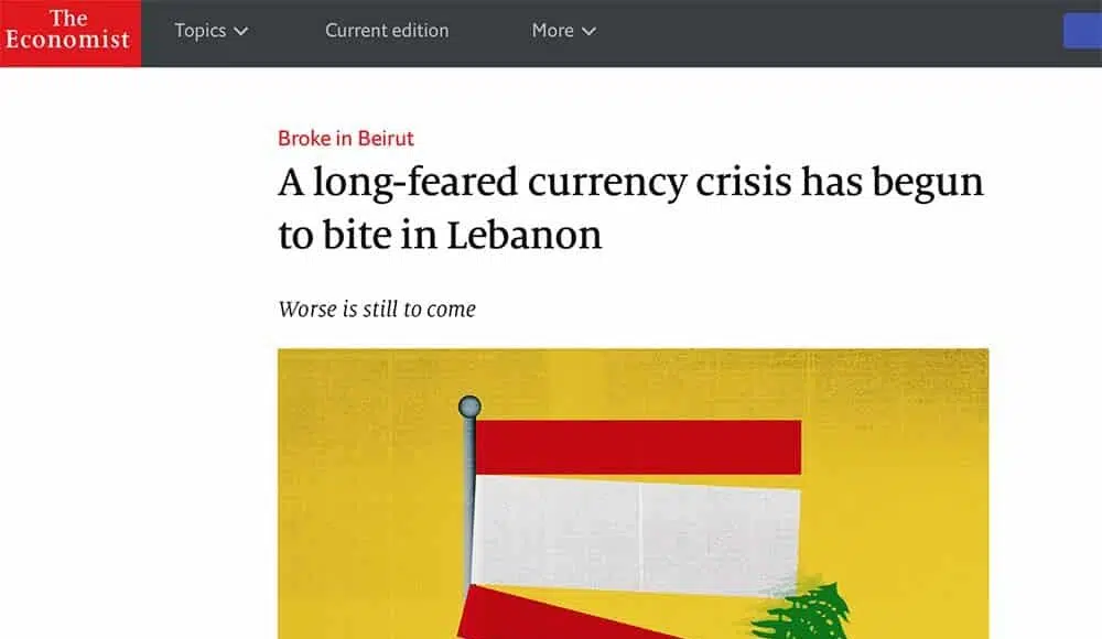 Une dépêche de l’ANI indique que 4 avocats libanais Khalil Qabbani, Rami Itani, Mohammad Doughan et Sana al-Rifai ont décidé de porter plainte devant le procureur public de la cour de cassation, le 5 octobre dernier, contre le Magazine The Economist, qui, dans sa dernière édition, a consacré un article intitulé « Broke in Beirut: A long-feared currency crisis has begun to bite in Lebanon », consacré à la crise économique que traverse le Liban.