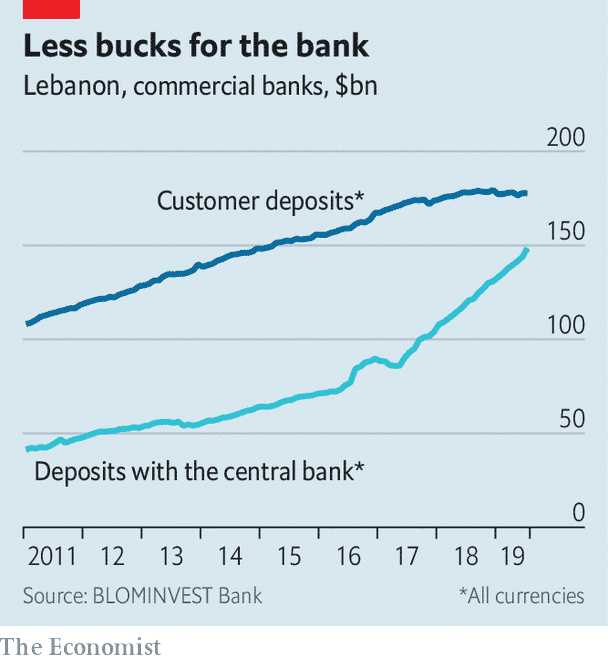 The Economist note également la diminution du cash inflow au sein des banques libanaises et de l’augmentation des dépôts de ces dernières à la Banque Centrale, en raison des importants taux accordés par cette dernière. Il s’agirait de la preuve, selon le magazine, que la Banque du Liban ne serait pas aussi bien placée que ce que disent les autorités officiels pour défendre la Livre Libanaise. Elle note également que les banques privées, souvent contrôlées par des hommes politiques ou leurs proches, ont longtemps bénéficié de ces arrangements avec l’institution publique.