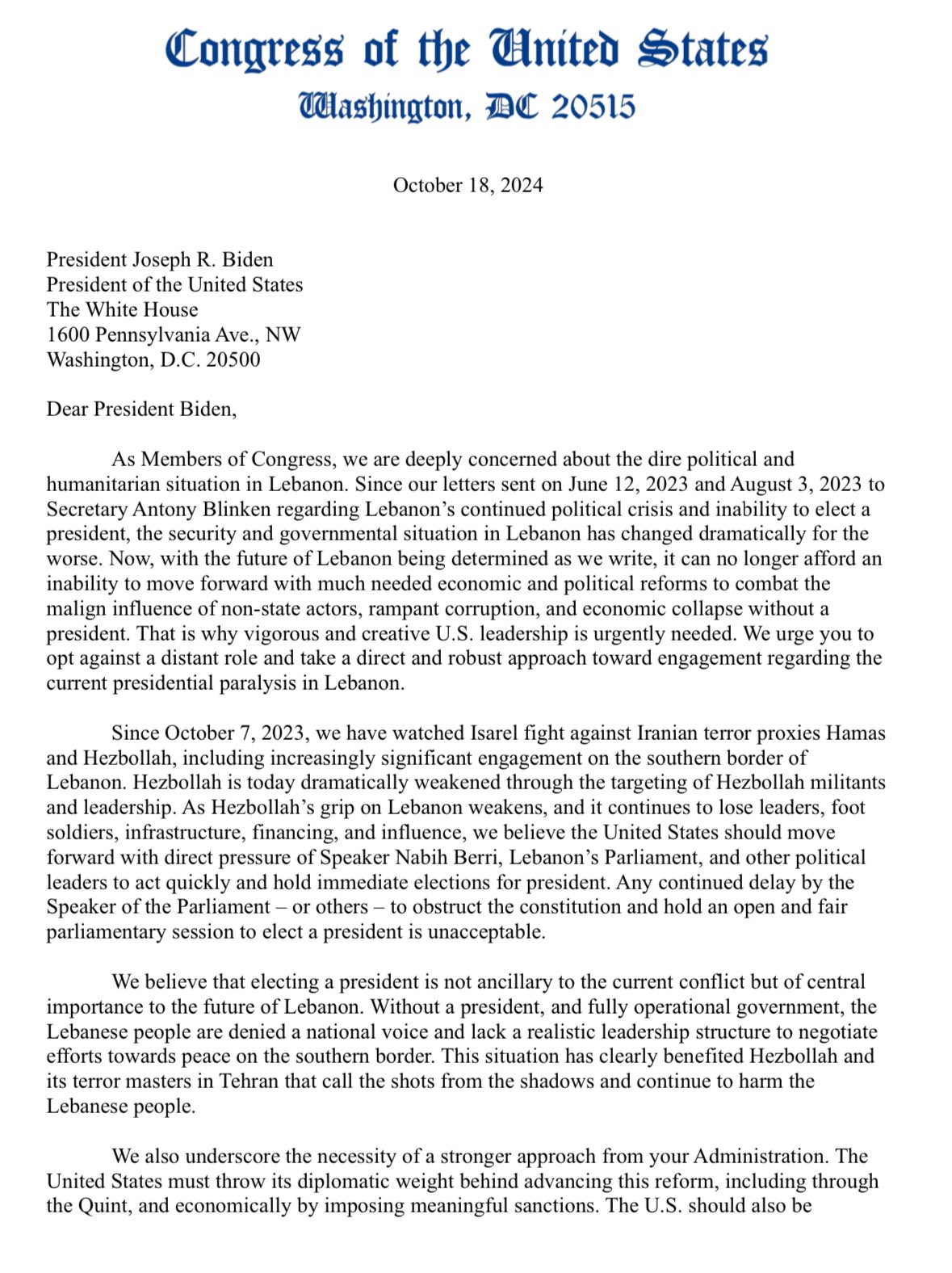 La lettre envoyée à Biden, également adressée au secrétaire d’État Antony Blinken et à la secrétaire au Trésor Janet Yellen, souligne que le blocage de l’élection présidentielle par Berri ne sert pas les intérêts du peuple libanais. Les membres du Congrès demandent aux États-Unis d’envisager des sanctions économiques, y compris le gel des avoirs en dollars, contre Berri et toute autre figure politique impliquée dans l’obstruction. Ils estiment qu’une pression financière pourrait forcer les responsables à accélérer le processus de réforme et de transition politique.