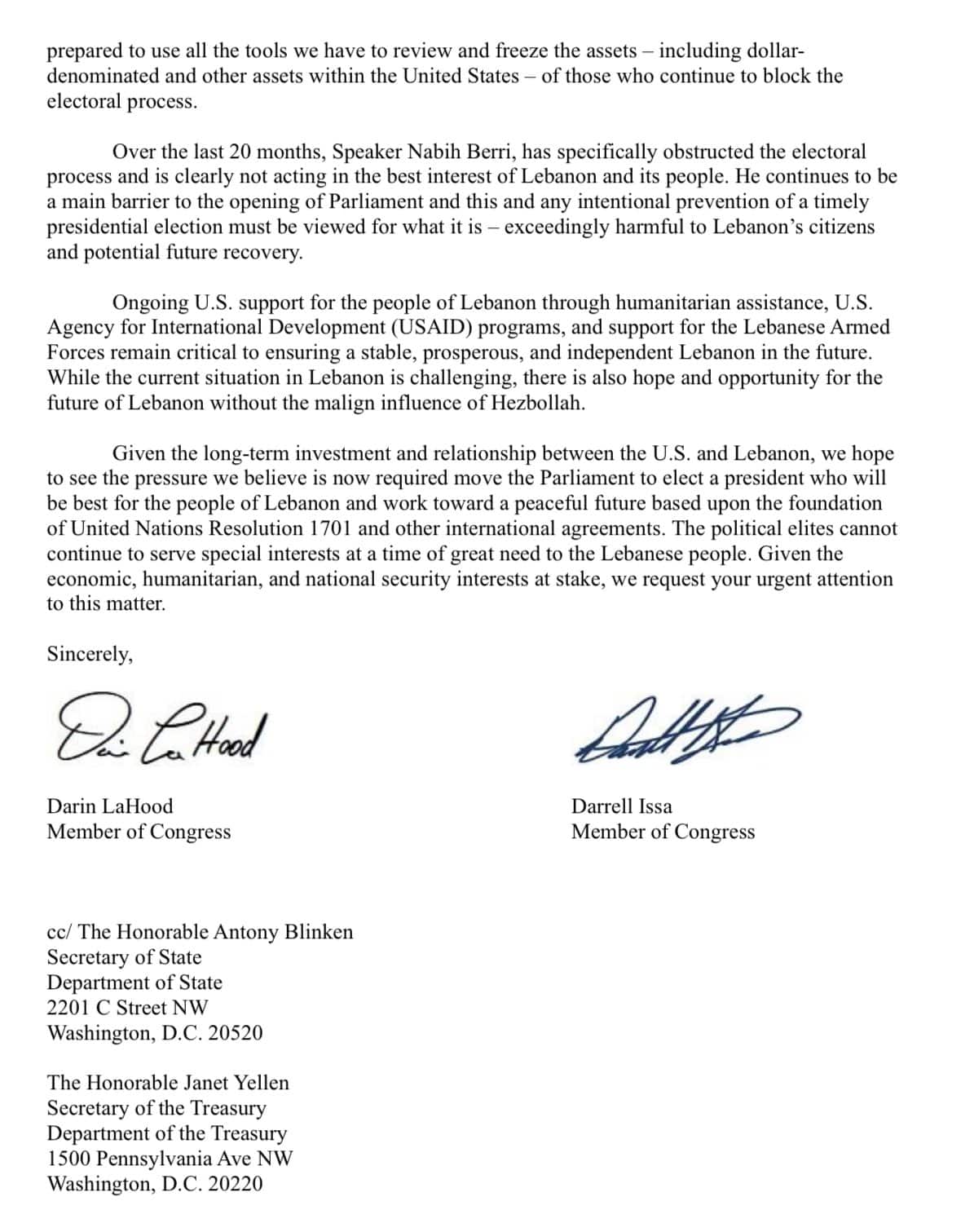 Les membres du Congrès américain Darin LaHood et Darrell Issa ont adressé une lettre au président Joe Biden, exhortant les États-Unis à imposer des sanctions contre Nabih Berri, président du Parlement libanais. Les législateurs accusent Berri de bloquer l’élection présidentielle au Liban, un pays en crise qui demeure sans chef d’État depuis plus d’un an. Ce blocage est perçu comme une menace pour la stabilité du Liban et un obstacle majeur aux réformes essentielles pour la reprise du pays.