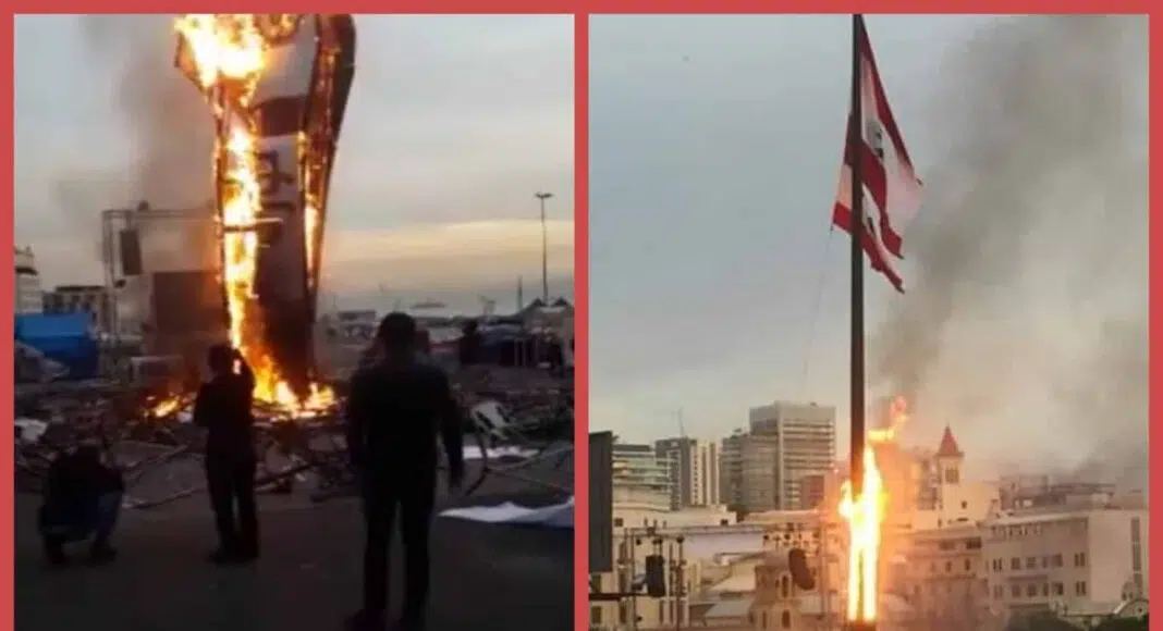 Vers 6h du matin, alors que la place des Martyrs s’apprête à être le spectacle du premier défilé citoyen à l’occasion de l’indépendance, des voyous se sont infiltrés parmi les tentes des manifestants et ont mis le feu au drapeau libanais ainsi qu’à l’installation du poing fermé avec le mot « Thawra » (Révolution) écrit dessus.