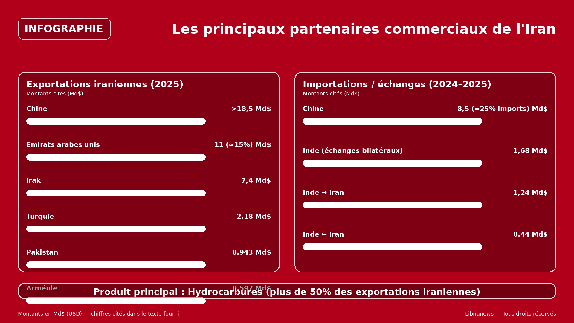 La Turquie occupe la troisième position, avec des échanges bilatéraux autour de 2,18 milliards de dollars en exportations iraniennes, focalisés sur l’énergie et les biens manufacturés. L’Inde, quatrième partenaire, a vu ses exportations vers l’Iran atteindre 1,24 milliard de dollars pour l’année fiscale 2024-2025, tandis que les importations depuis l’Iran, principalement du pétrole brut, s’élèvent à 440 millions de dollars. D’autres nations comme l’Irak (7,4 milliards de dollars en exportations iraniennes), le Pakistan (943 millions) et l’Arménie (597 millions) complètent le tableau.