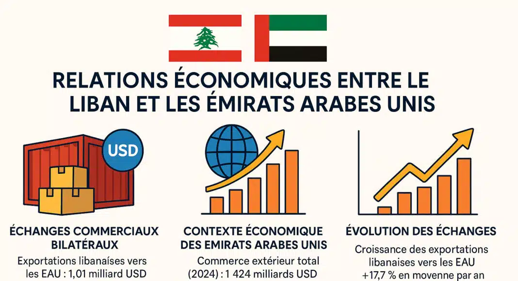 Le Liban a exporté pour 1,01 milliard de dollars de marchandises vers les Émirats arabes unis en 2023, selon les données officielles du ministère de l’Économie libanais. Ce chiffre représente près de 20 % de l’ensemble des exportations libanaises, confirmant les Émirats comme le premier débouché commercial du pays. À l’inverse, les importations libanaises en provenance des EAU restent marginales, révélant un déficit d’échanges déséquilibré, mais avantageux à court terme pour la balance commerciale libanaise.