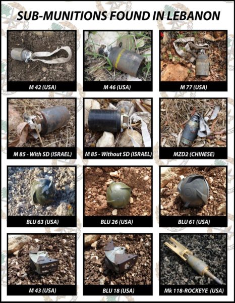 - 550 000 mines laissées par Israël lors de son retrait en 2 000 après 12 ans d’occupation et 1 000 000 de bombes à sous-munitions qui n’ont pas explosé sur les 4 millions de bombes à fragmentation larguées par l’état hébreu lors du conflit israélo-libanais de juillet 2006 sur une zone de 55 kilomètres carrés où résident 1 million de personnes.