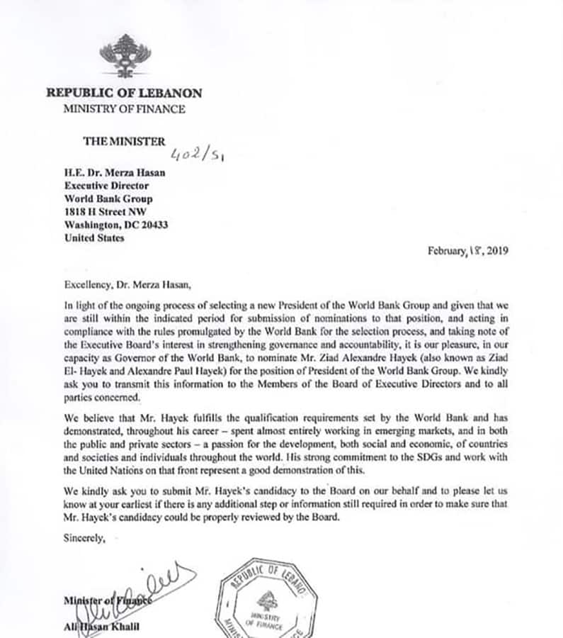 En dépit de la crise et des problèmes économique et du fait que la Banque Mondiale participe au programme d’aide CEDRE au Liban, le Pays des Cèdres a présenté la candidature de Ziad Hayek pour succéder à Jim Yong Kim dont le mandat s’est achevé le 1er février à la tête de la Banque Mondiale.